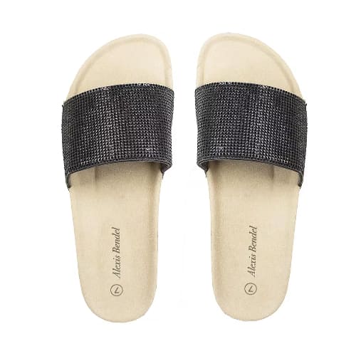 This slip‑on slide sandal from Alexis Bendel showcases rhinestone embellishments, a faux leather upper and a cork sole—merging sparkle style with cushioned comfort.